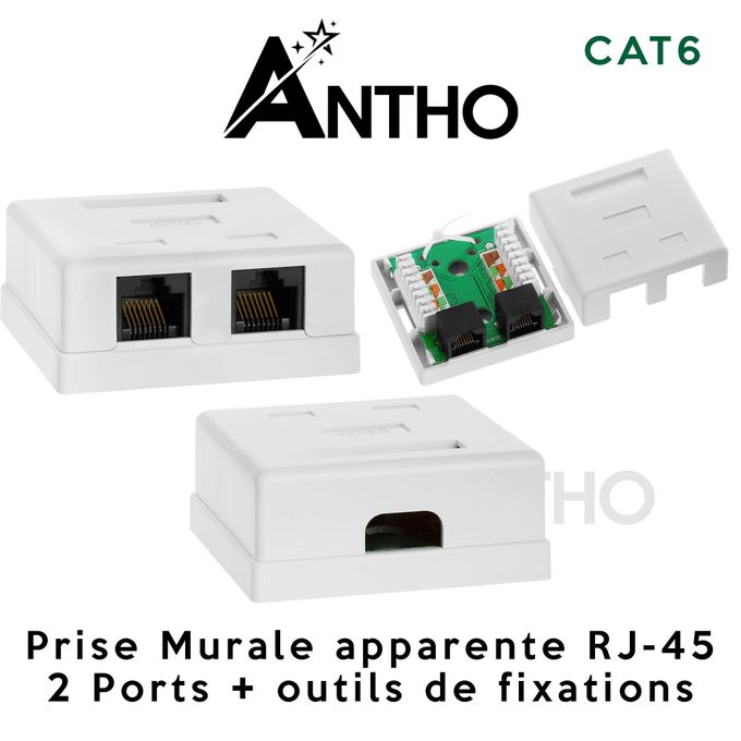 ANTHO Prise Murale RJ-45 Apparente – 2 Ports – RJ45 – CAT 6 – Blanc
