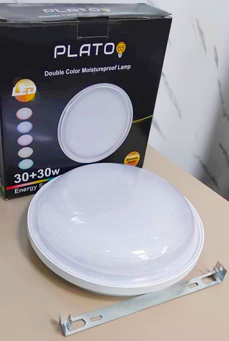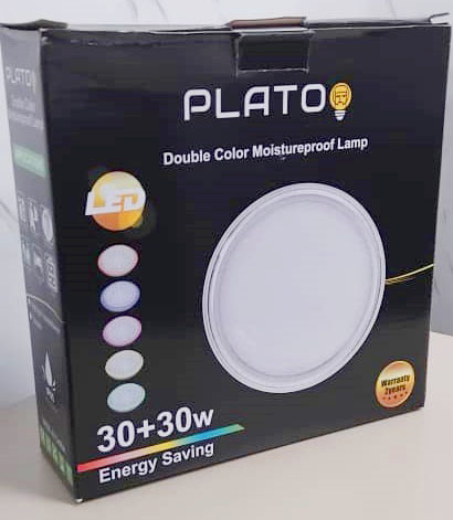 - Puissance : La puissance indiquée est de 30+30w. Cela suggère souvent une capacité à changer de couleur ou de température de lumière, par exemple entre blanc froid (6000K-6500K) et blanc chaud (3000K), ce qui est confirmé par les indicateurs de couleur sur la boîte.