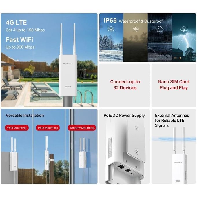 MB118 Outdoor est l’antenne routeur de Mercusys dotée d’une connectivité 4G LTE, conçue pour surmonter les problèmes de réception du signal à l’intérieur de la maison, causés par des murs trop épais et bloquants. Insérez simplement une carte SIM nano pour offrir une connectivité continue jusqu’à 32 appareils sans fil.